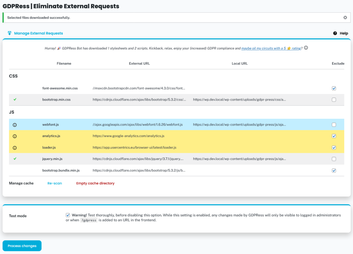 The “Save Changes & Download” button is now called Process Changes — because sometimes it downloads, and sometimes it deletes. It now also properly removes locally hosted files when you exclude a resource. Clean instincts, GDPRess Bot.